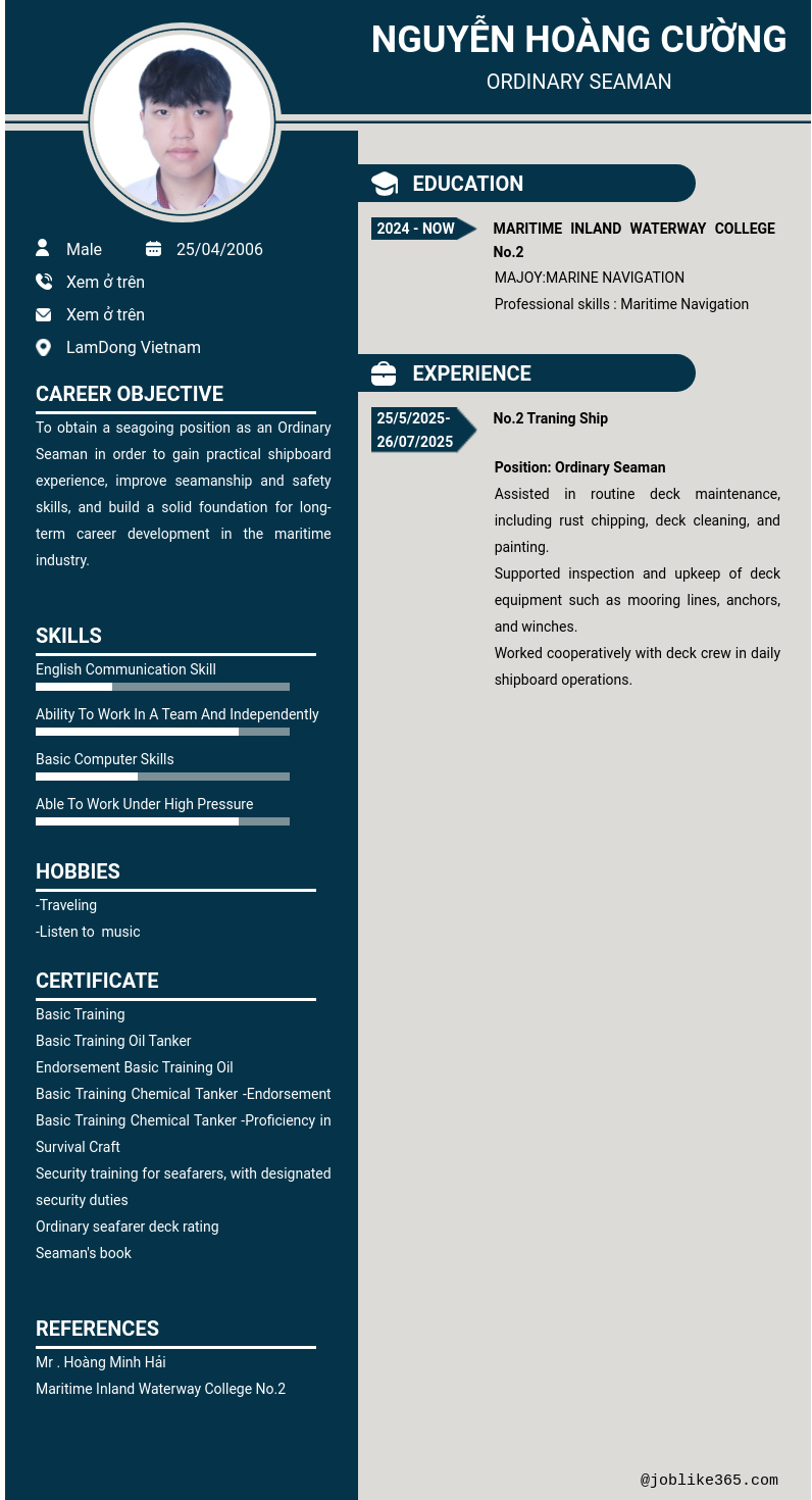 Xem hồ sơ ứng viên NGUYỄN HOÀNG CƯỜNG cần 2 điểm. Hồ sơ được cập nhật ngày: 16/01/2026