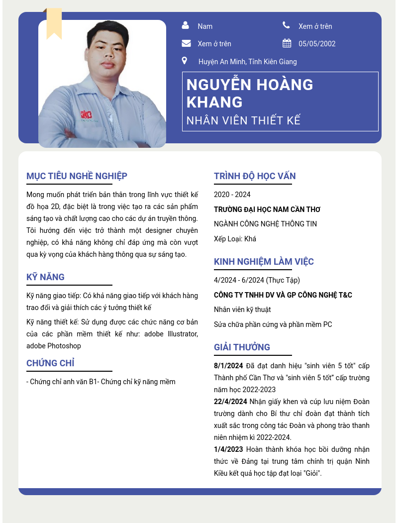 Xem hồ sơ ứng viên Nguyễn Hoàng Khang cần 2 điểm. Hồ sơ được cập nhật ngày: 07/11/2024