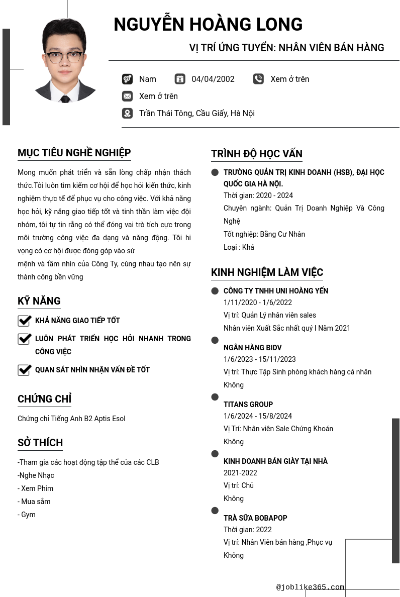 Xem hồ sơ ứng viên Nguyễn Hoàng Long cần 2 điểm. Hồ sơ được cập nhật ngày: 07/10/2024