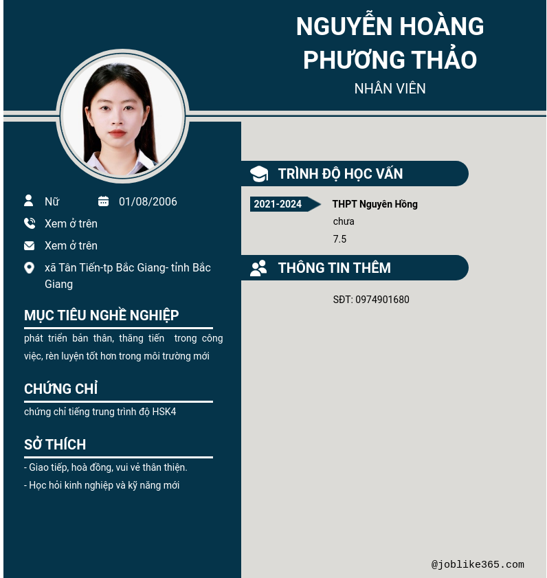 Xem hồ sơ ứng viên Nguyễn Hoàng Phương Thảo cần 2 điểm. Hồ sơ được cập nhật ngày: 29/08/2024
