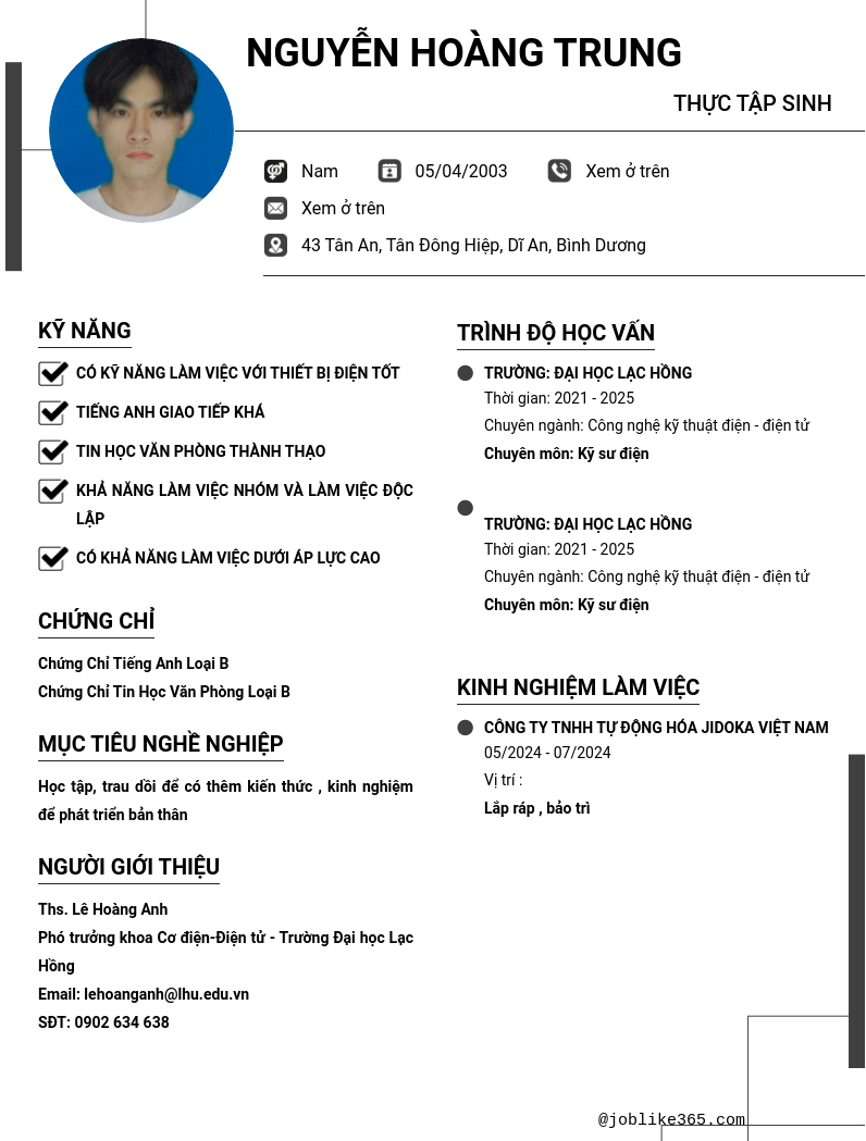 Xem hồ sơ ứng viên Nguyễn Hoàng Trung cần 2 điểm. Hồ sơ được cập nhật ngày: 15/03/2025