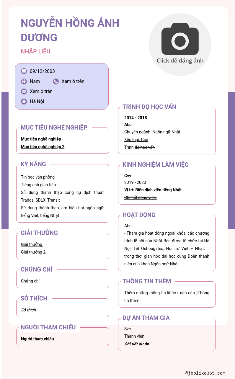 Xem hồ sơ ứng viên NGUYỄN HỒNG ÁNH DƯƠNG cần 2 điểm. Hồ sơ được cập nhật ngày: 23/02/2025