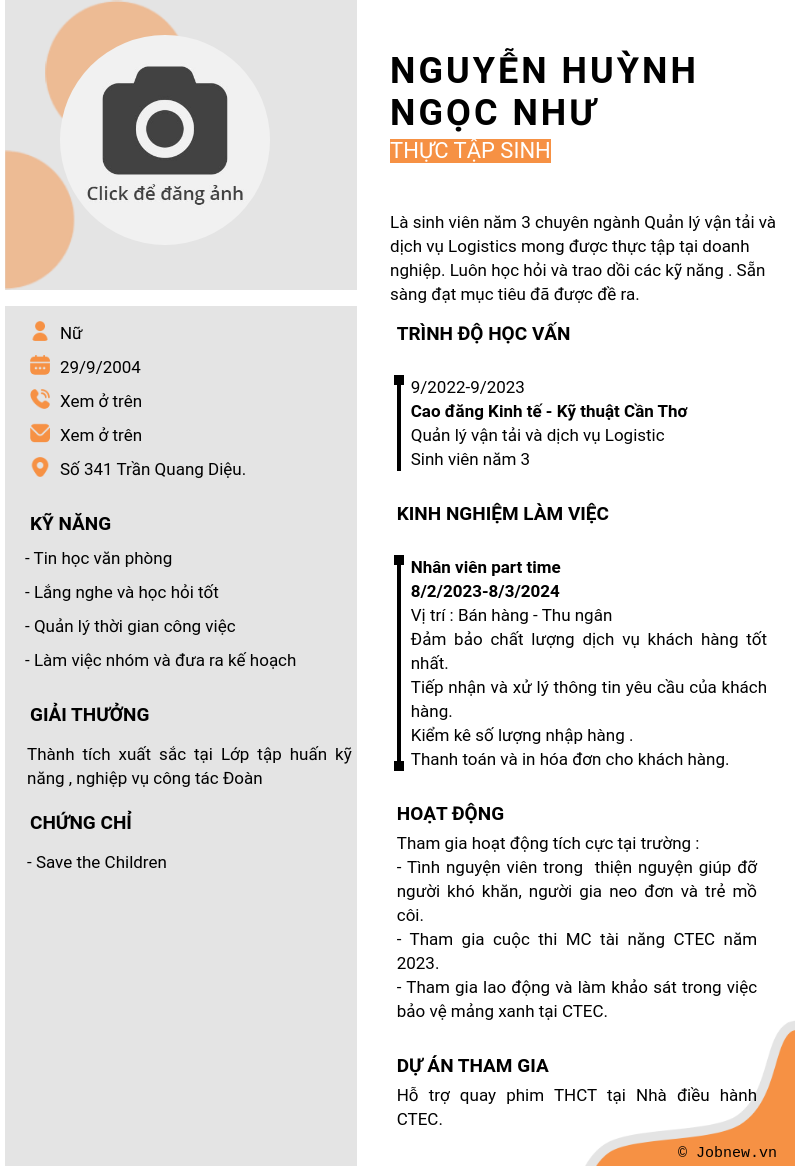 Xem hồ sơ ứng viên nguyễn huỳnh ngọc như cần 2 điểm. Hồ sơ được cập nhật ngày: 20/08/2024