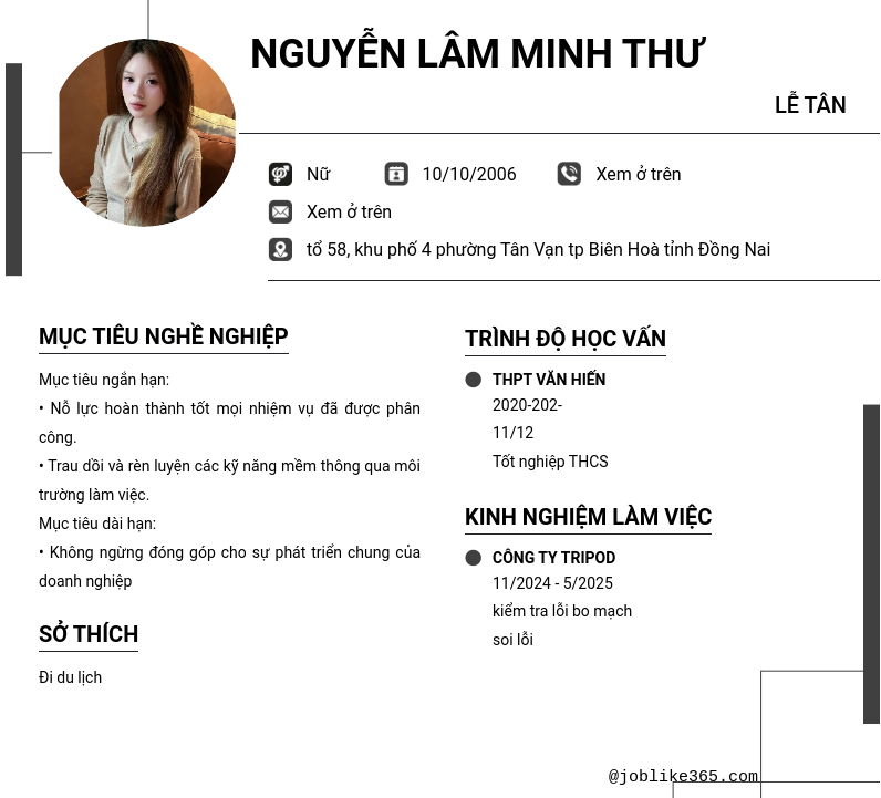 Xem hồ sơ ứng viên NGUYỄN LÂM MINH THƯ cần 2 điểm. Hồ sơ được cập nhật ngày: 13/06/2025