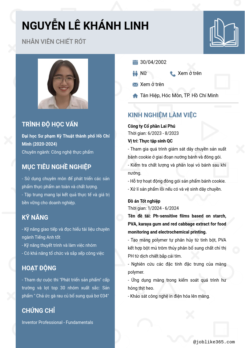 Xem hồ sơ ứng viên nguyễn lê khánh linh cần 2 điểm. Hồ sơ được cập nhật ngày: 23/11/2024