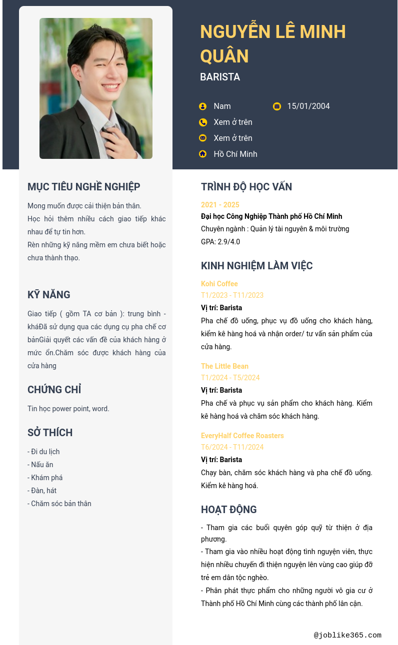 Xem hồ sơ ứng viên Nguyễn Lê Minh Quân cần 2 điểm. Hồ sơ được cập nhật ngày: 14/11/2024