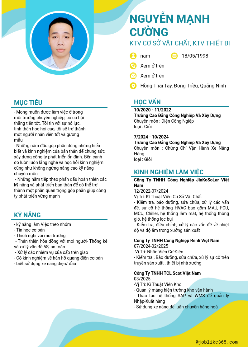 Xem hồ sơ ứng viên Nguyễn mạnh cường cần 2 điểm. Hồ sơ được cập nhật ngày: 08/10/2025