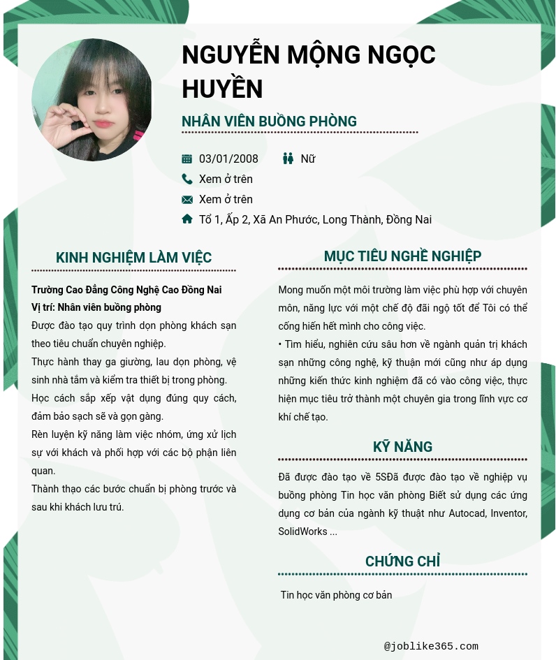 Xem hồ sơ ứng viên Nguyễn Mộng Ngọc Huyền cần 2 điểm. Hồ sơ được cập nhật ngày: 10/06/2025