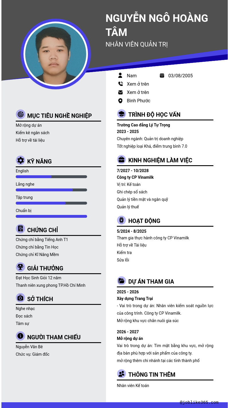 Xem hồ sơ ứng viên Nguyễn Ngô Hoàng Tâm cần 2 điểm. Hồ sơ được cập nhật ngày: 11/09/2024