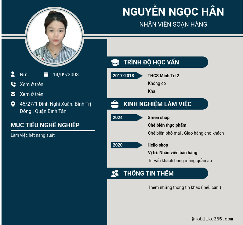 Xem hồ sơ ứng viên Nguyễn Ngọc Hân cần 2 điểm. Hồ sơ được cập nhật ngày: 23/09/2024