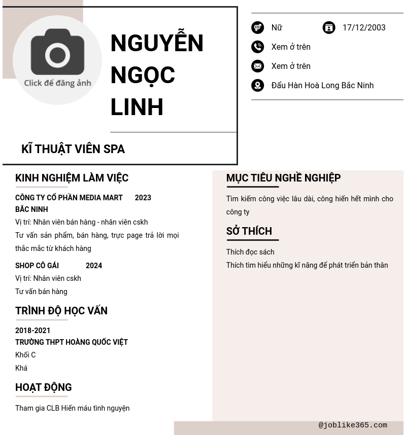 Xem hồ sơ ứng viên Nguyễn Ngọc Linh cần 2 điểm. Hồ sơ được cập nhật ngày: 25/07/2024