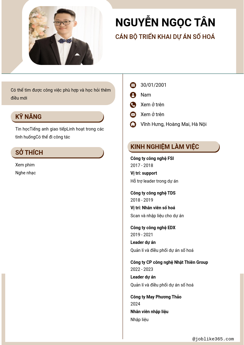 Xem hồ sơ ứng viên Nguyễn Ngọc Tân cần 2 điểm. Hồ sơ được cập nhật ngày: 13/09/2024