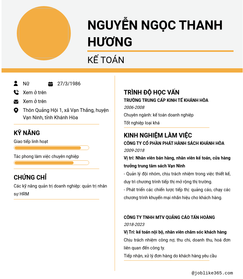 Xem hồ sơ ứng viên Nguyễn Ngọc Thanh Hương cần 2 điểm. Hồ sơ được cập nhật ngày: 14/08/2024
