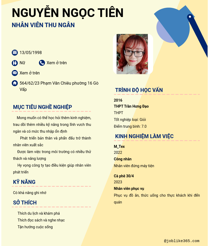 Xem hồ sơ ứng viên Nguyễn Ngọc Tiên cần 2 điểm. Hồ sơ được cập nhật ngày: 14/11/2024