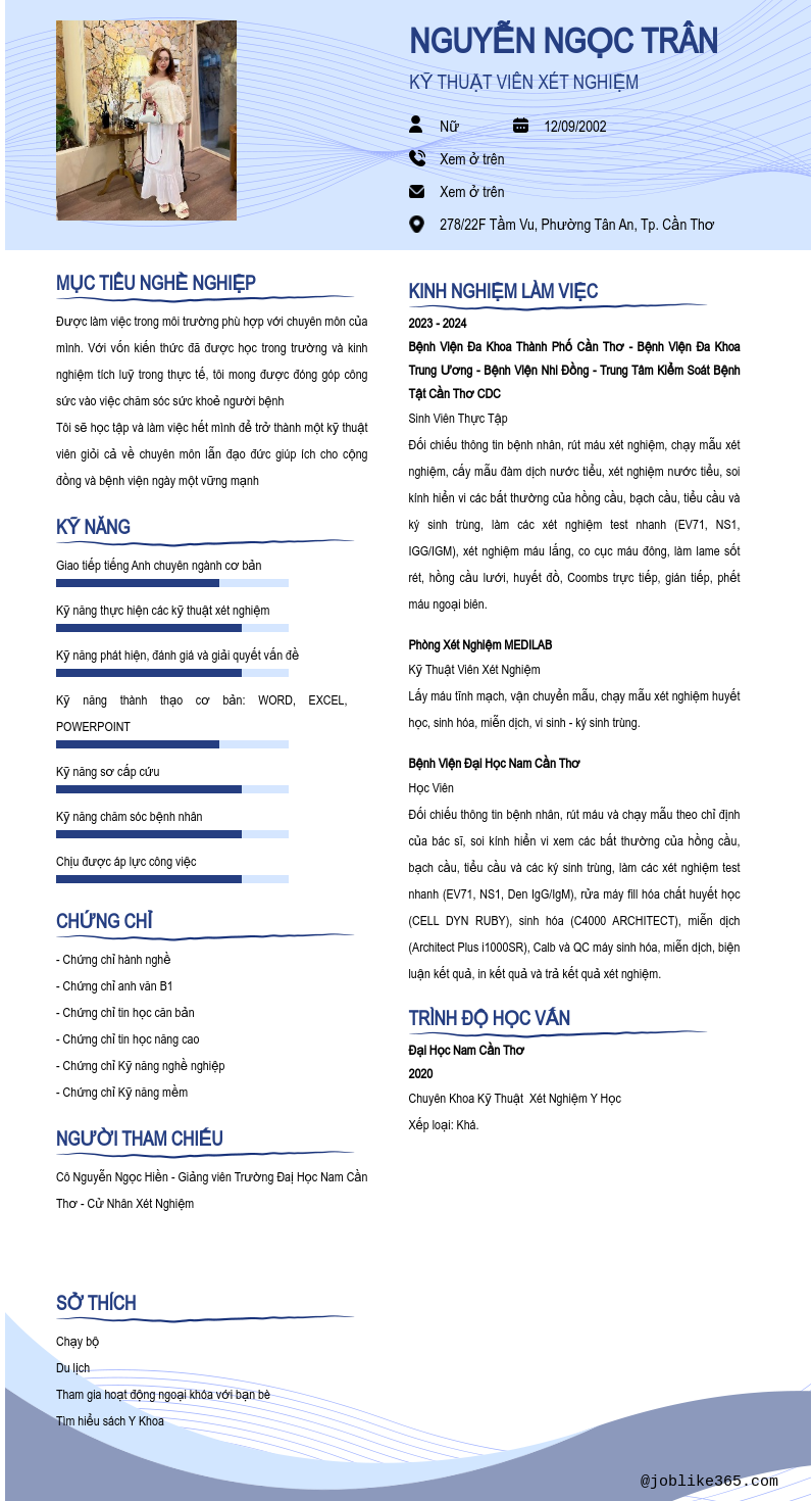 Xem hồ sơ ứng viên NGUYỄN NGỌC TRÂN cần 2 điểm. Hồ sơ được cập nhật ngày: 24/08/2025