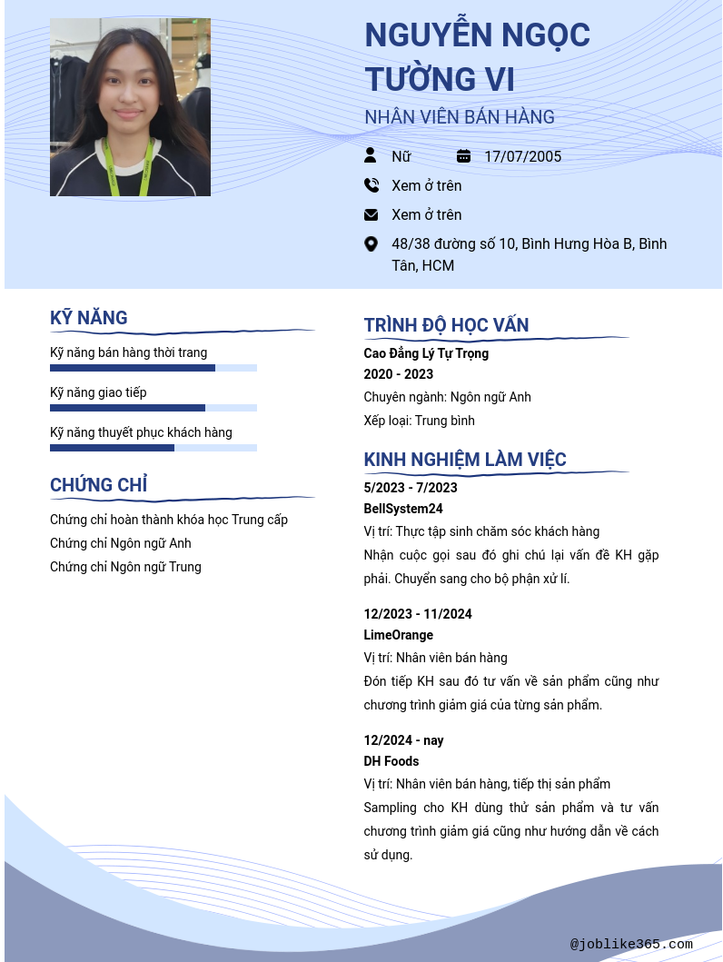 Xem hồ sơ ứng viên Nguyễn Ngọc Tường Vi cần 2 điểm. Hồ sơ được cập nhật ngày: 18/01/2025