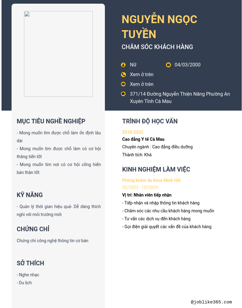 Xem hồ sơ ứng viên NGUYỄN NGỌC TUYỀN cần 2 điểm. Hồ sơ được cập nhật ngày: 21/10/2025