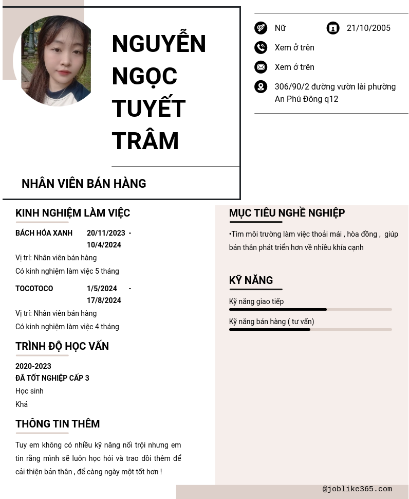 Xem hồ sơ ứng viên Nguyễn Ngọc Tuyết Trâm cần 2 điểm. Hồ sơ được cập nhật ngày: 17/08/2024