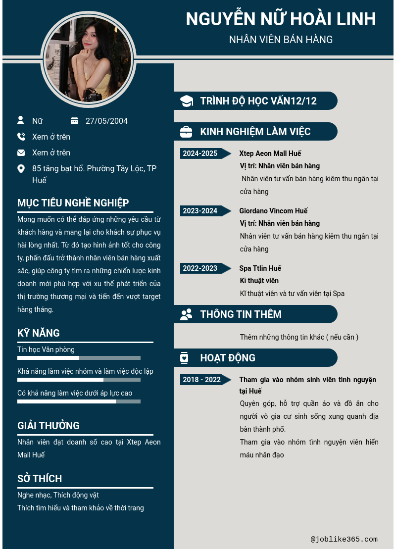 Xem hồ sơ ứng viên Nguyễn Nữ Hoài Linh cần 2 điểm. Hồ sơ được cập nhật ngày: 17/06/2025