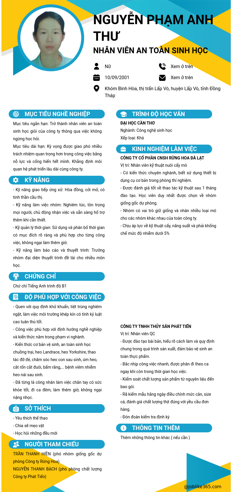 Xem hồ sơ ứng viên NGUYỄN PHẠM ANH THƯ cần 2 điểm. Hồ sơ được cập nhật ngày: 02/06/2024