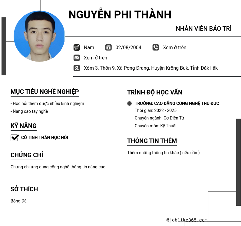 Xem hồ sơ ứng viên nguyễn phi thành cần 2 điểm. Hồ sơ được cập nhật ngày: 20/09/2024