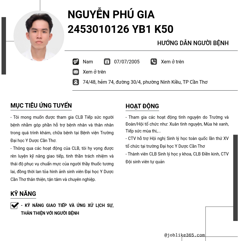 Xem hồ sơ ứng viên Nguyễn Phú Gia 2453010126 YB1 K50 cần 2 điểm. Hồ sơ được cập nhật ngày: 17/10/2025