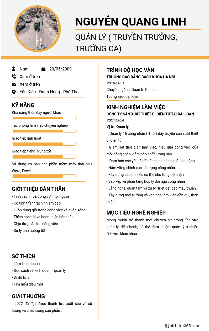 Xem hồ sơ ứng viên nguyễn quang linh cần 2 điểm. Hồ sơ được cập nhật ngày: 02/03/2025