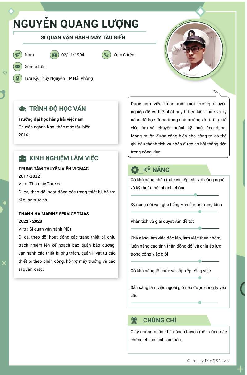 Xem hồ sơ ứng viên Nguyễn Quang lượng cần 2 điểm. Hồ sơ được cập nhật ngày: 21/09/2024