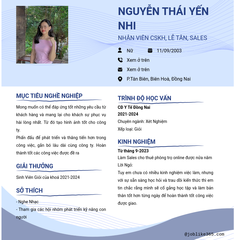 Xem hồ sơ ứng viên NGUYỄN THÁI YẾN NHI cần 2 điểm. Hồ sơ được cập nhật ngày: 02/08/2024