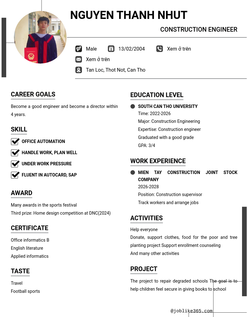 Xem hồ sơ ứng viên Nguyen Thanh Nhut cần 2 điểm. Hồ sơ được cập nhật ngày: 16/09/2024