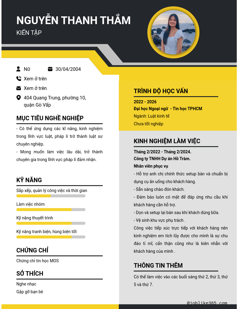 Xem hồ sơ ứng viên NGUYỄN THANH THẮM cần 2 điểm. Hồ sơ được cập nhật ngày: 02/10/2024