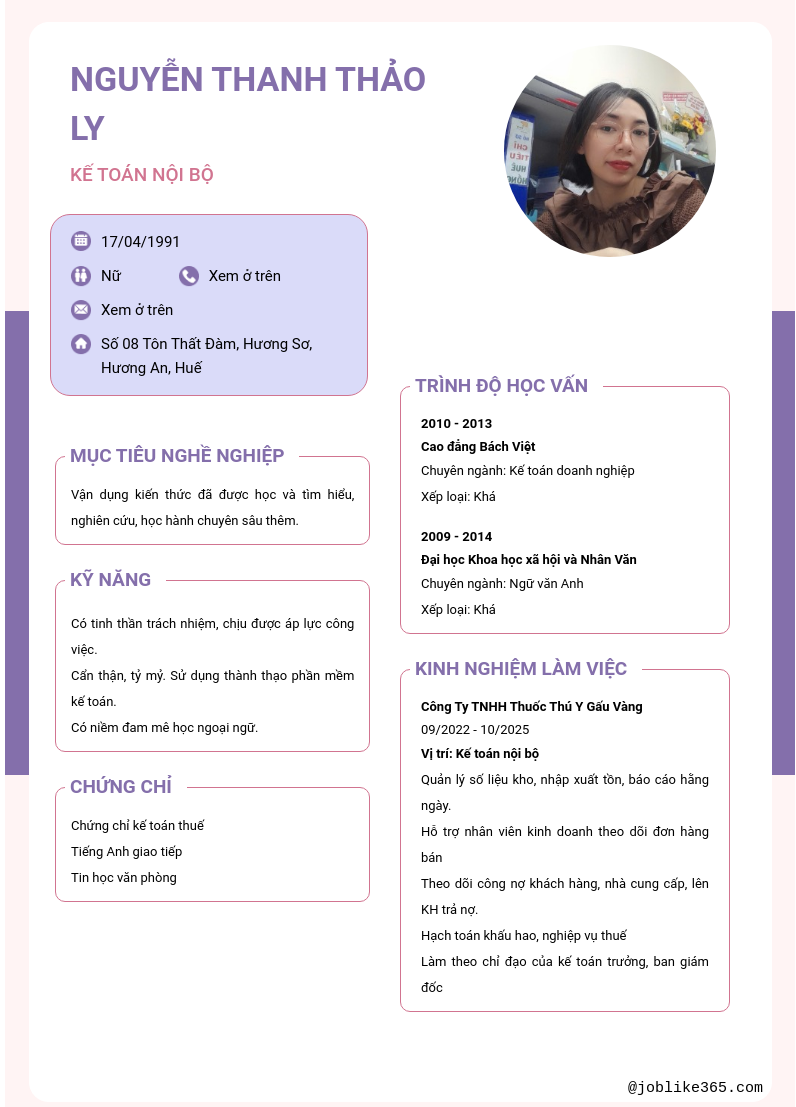 Xem hồ sơ ứng viên nguyễn thanh thảo ly cần 2 điểm. Hồ sơ được cập nhật ngày: 11/04/2026