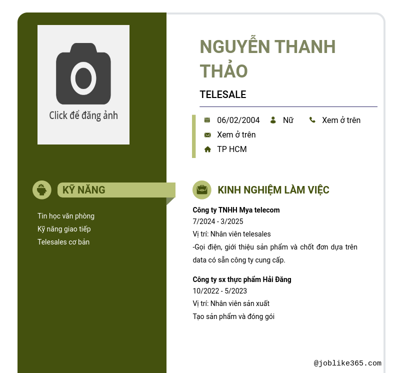 Xem hồ sơ ứng viên Nguyễn Thanh thảo cần 2 điểm. Hồ sơ được cập nhật ngày: 10/06/2025