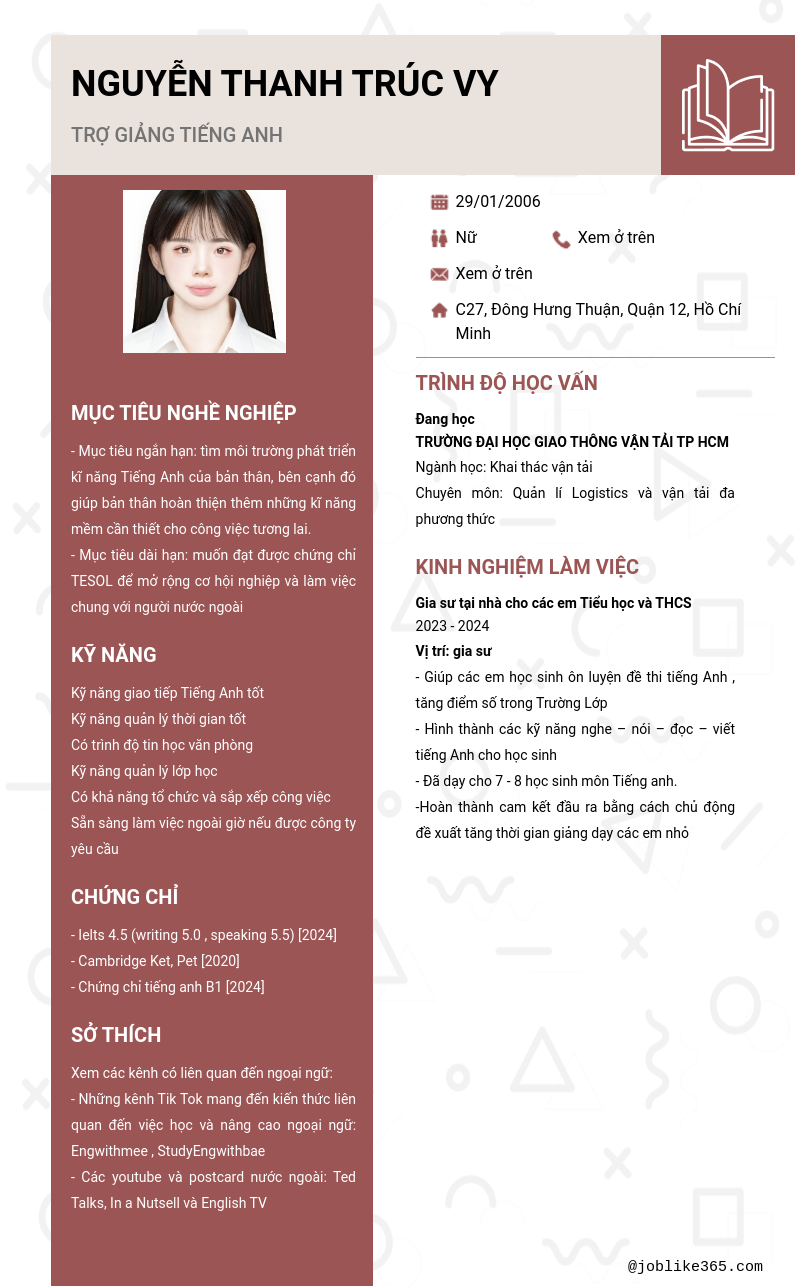 Xem hồ sơ ứng viên NGUYỄN THANH TRÚC VY cần 2 điểm. Hồ sơ được cập nhật ngày: 22/11/2024