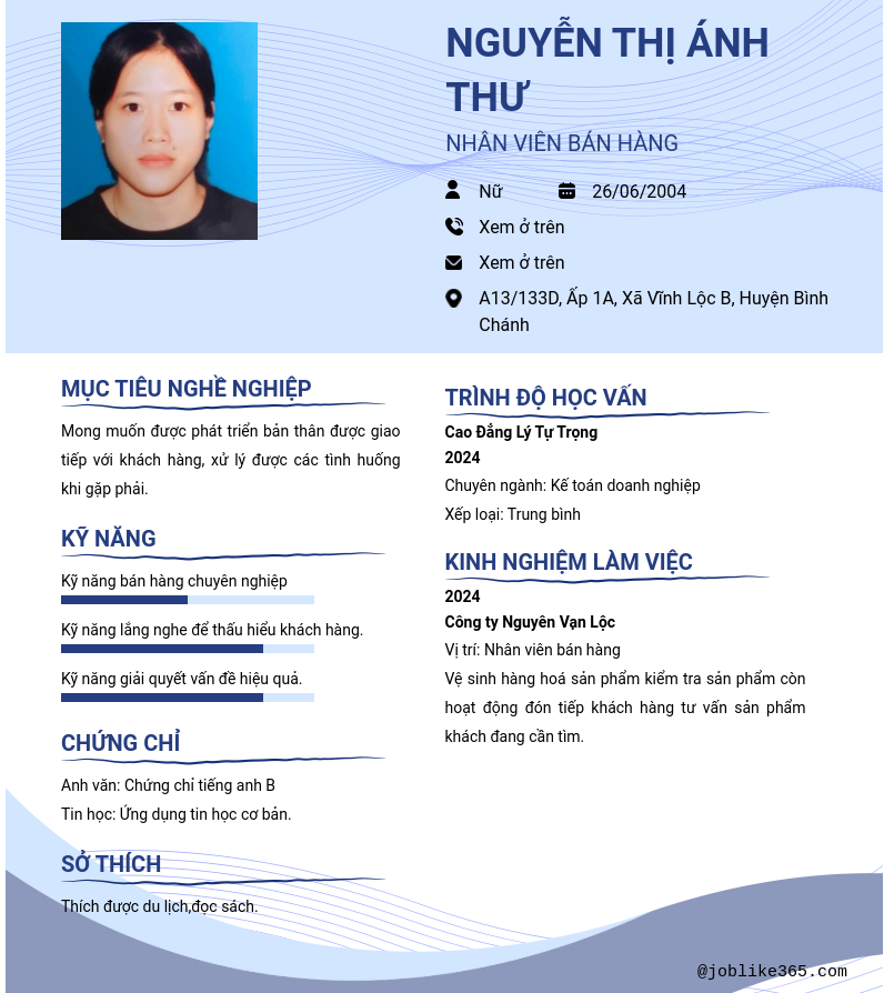 Xem hồ sơ ứng viên Nguyễn Thị Ánh Thư cần 2 điểm. Hồ sơ được cập nhật ngày: 27/02/2025