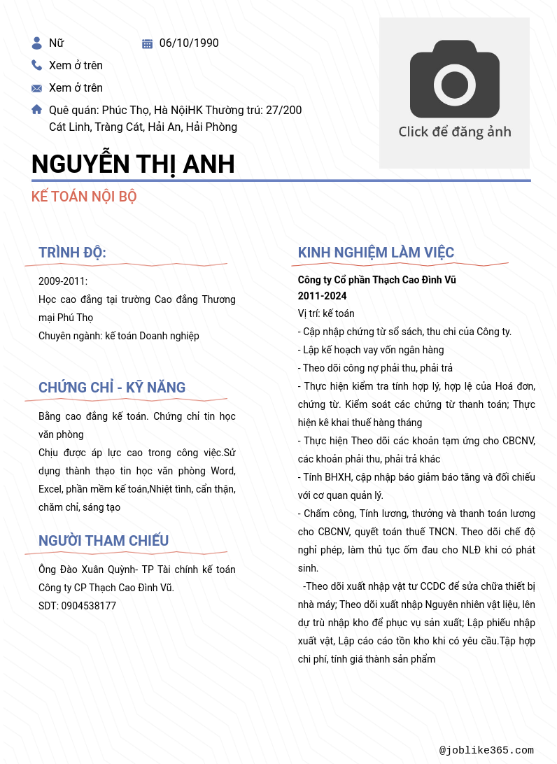 Xem hồ sơ ứng viên Nguyễn Thị ANh cần 2 điểm. Hồ sơ được cập nhật ngày: 25/11/2024