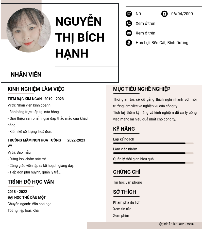 Xem hồ sơ ứng viên Nguyễn Thị Bích Hạnh cần 2 điểm. Hồ sơ được cập nhật ngày: 03/10/2024