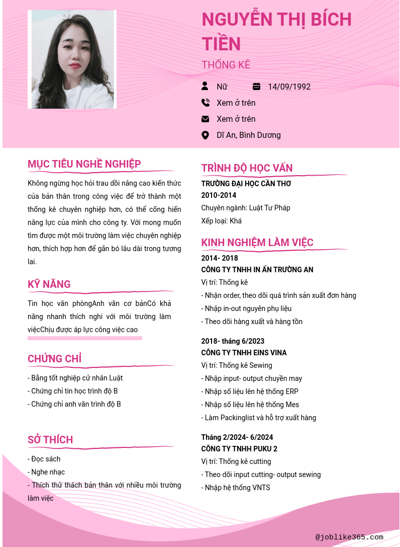 Xem hồ sơ ứng viên NGUYỄN THỊ BÍCH TIỀN cần 2 điểm. Hồ sơ được cập nhật ngày: 29/08/2024