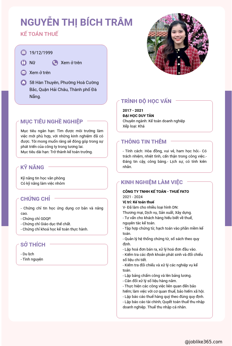Xem hồ sơ ứng viên NGUYỄN THỊ BÍCH TRÂM cần 2 điểm. Hồ sơ được cập nhật ngày: 25/06/2024