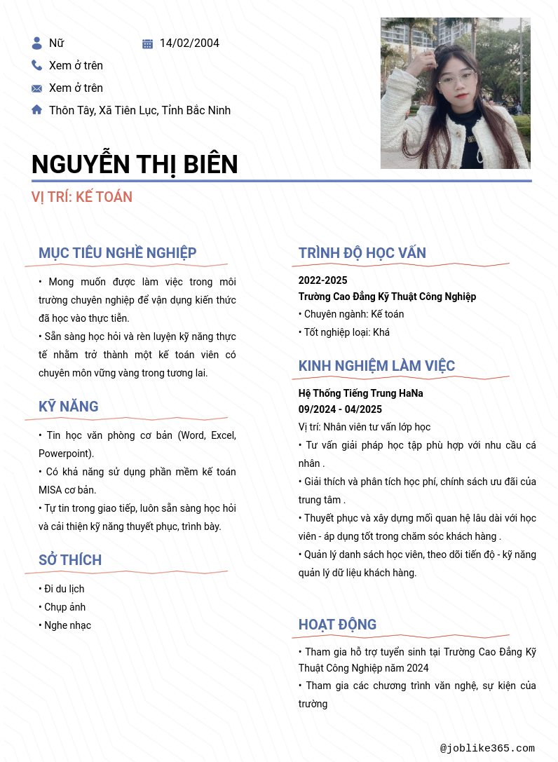 Xem hồ sơ ứng viên Nguyễn Thị Biên cần 2 điểm. Hồ sơ được cập nhật ngày: 04/09/2025