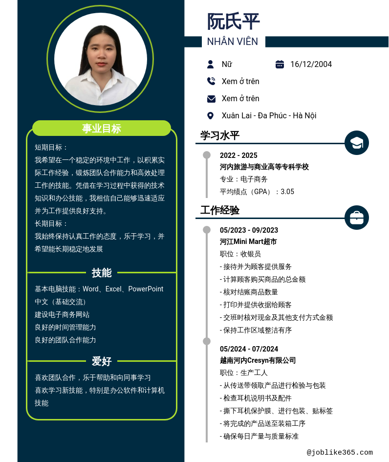 Xem hồ sơ ứng viên 阮氏平 cần 2 điểm. Hồ sơ được cập nhật ngày: 23/09/2025