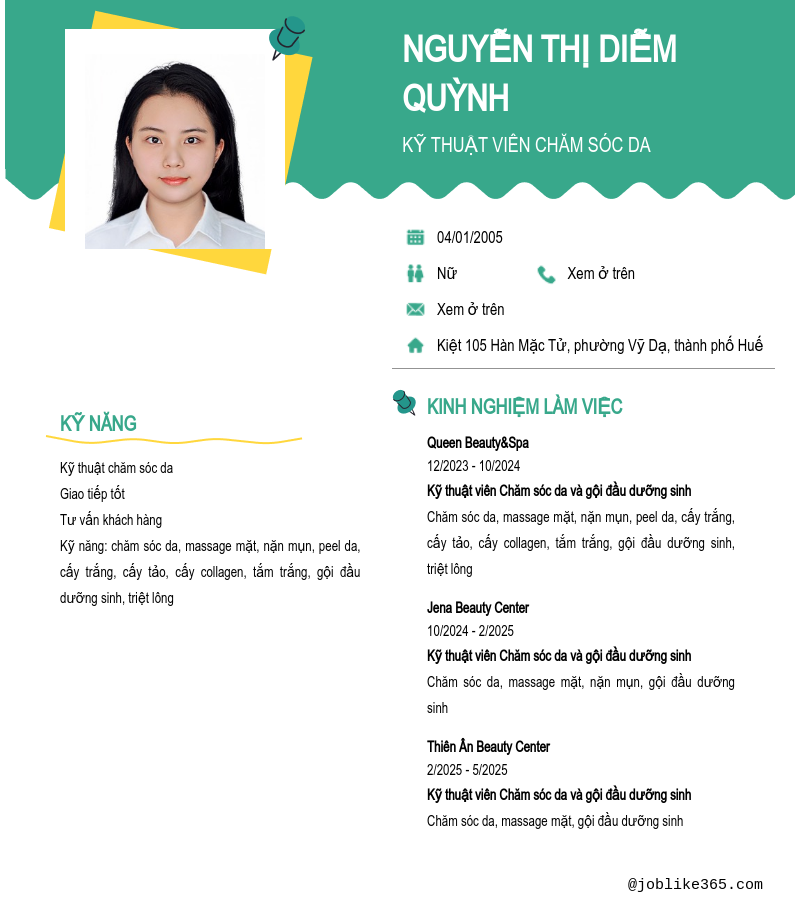 Xem hồ sơ ứng viên Nguyễn Thị Diễm Quỳnh cần 2 điểm. Hồ sơ được cập nhật ngày: 19/05/2025