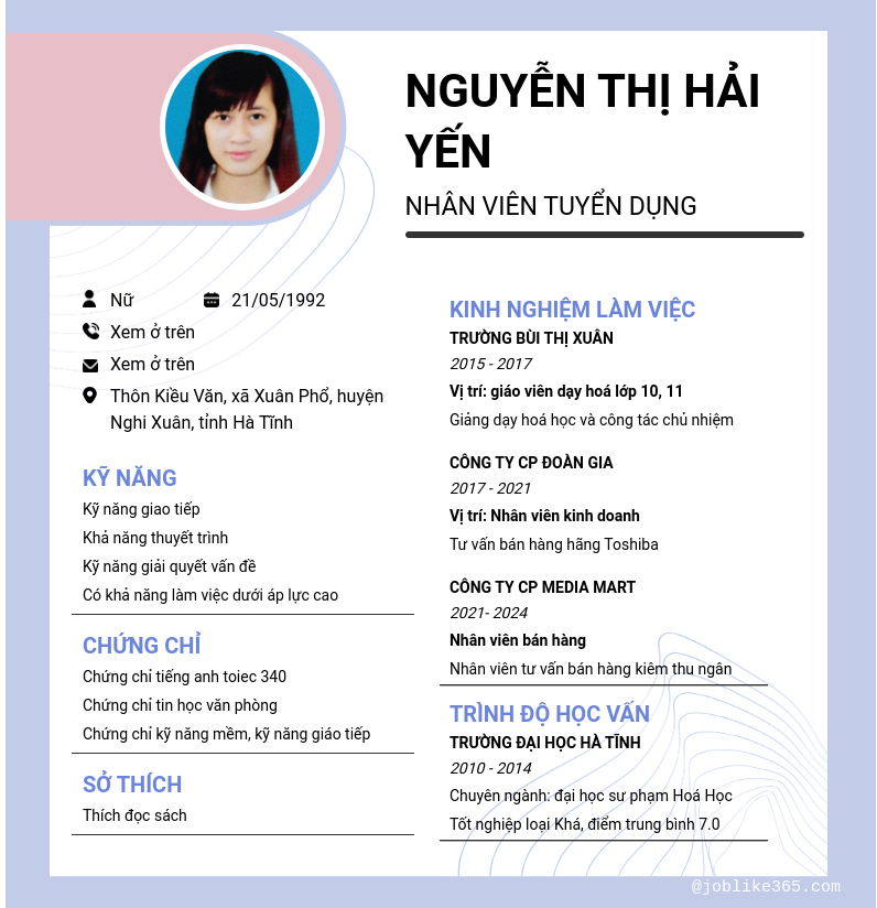 Xem hồ sơ ứng viên Nguyễn Thị Hải Yến cần 2 điểm. Hồ sơ được cập nhật ngày: 16/11/2024