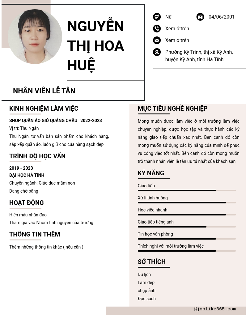 Xem hồ sơ ứng viên Nguyễn Thị Hoa Huệ cần 2 điểm. Hồ sơ được cập nhật ngày: 27/08/2024