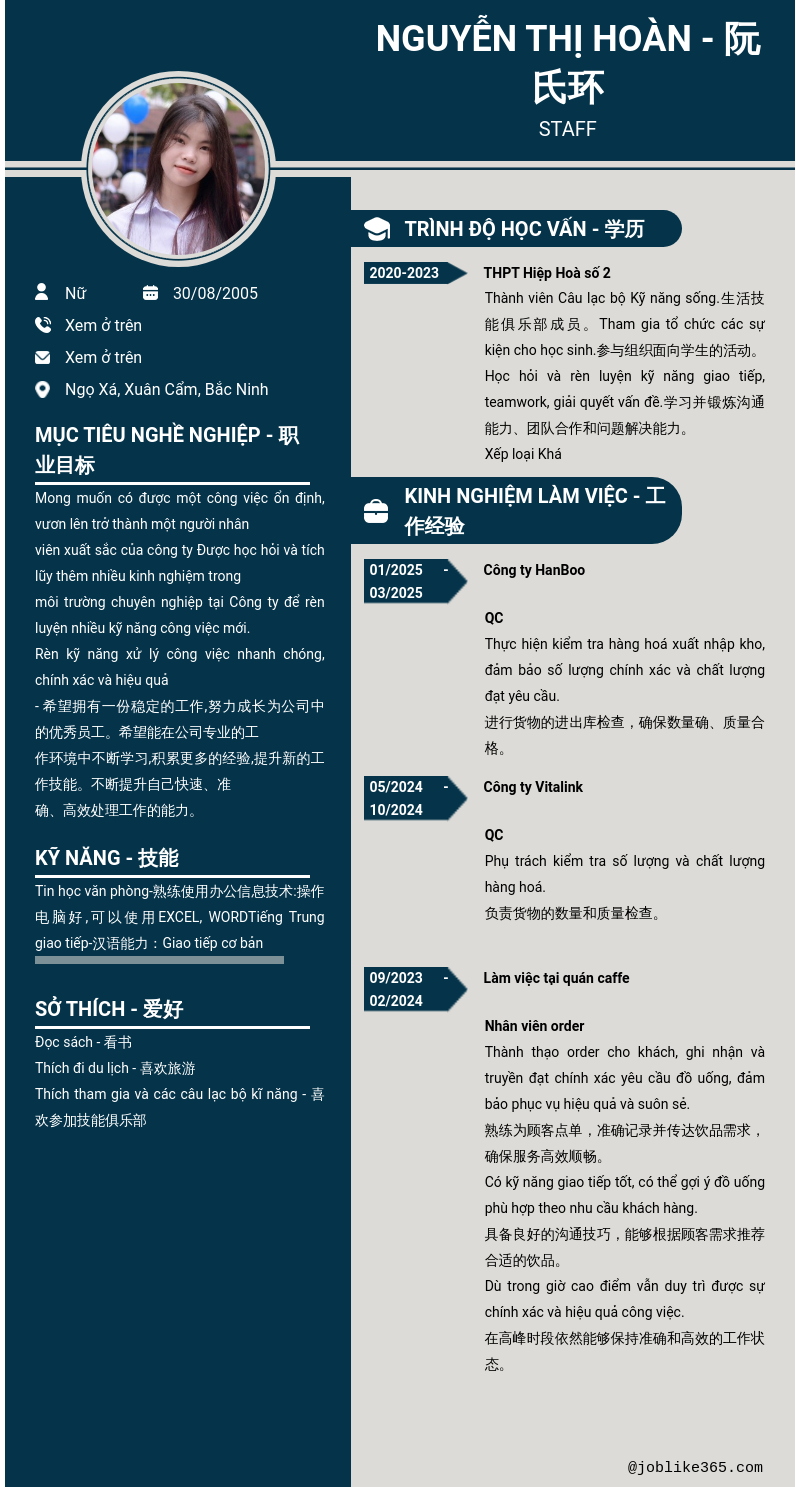 Xem hồ sơ ứng viên NGUYỄN THỊ HOÀN - 阮氏环 cần 2 điểm. Hồ sơ được cập nhật ngày: 13/08/2025