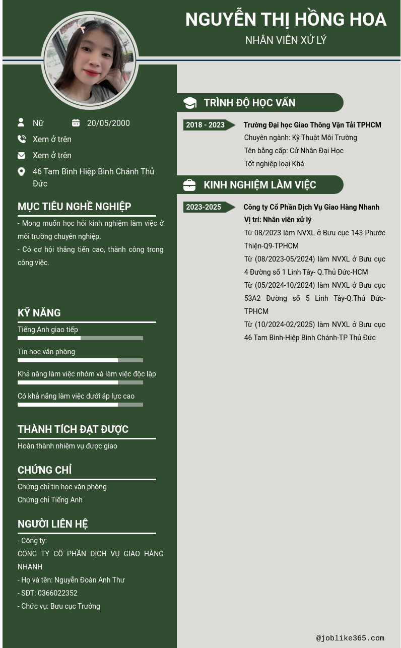 Xem hồ sơ ứng viên Nguyễn Thị Hồng Hoa cần 2 điểm. Hồ sơ được cập nhật ngày: 26/02/2025