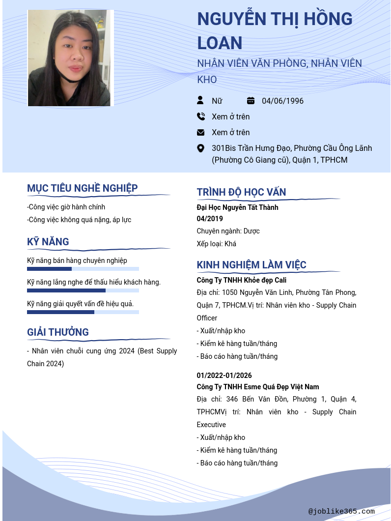 Xem hồ sơ ứng viên Nguyễn thị HỒNG LOAN cần 2 điểm. Hồ sơ được cập nhật ngày: 14/01/2026