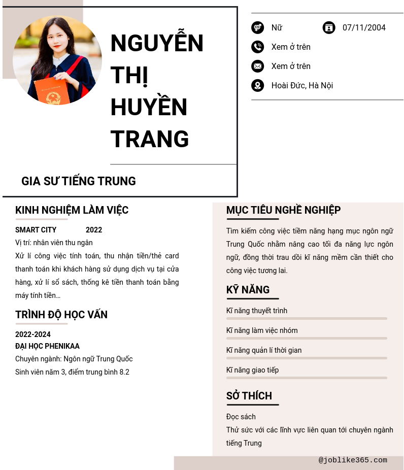 Xem hồ sơ ứng viên Nguyễn Thị Huyền Trang cần 2 điểm. Hồ sơ được cập nhật ngày: 06/11/2024