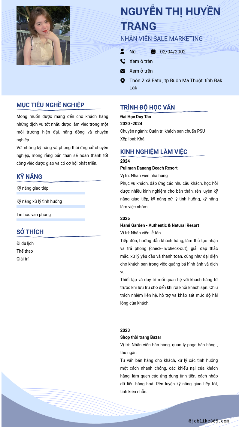 Xem hồ sơ ứng viên Nguyễn thị huyền trang cần 2 điểm. Hồ sơ được cập nhật ngày: 30/11/2025