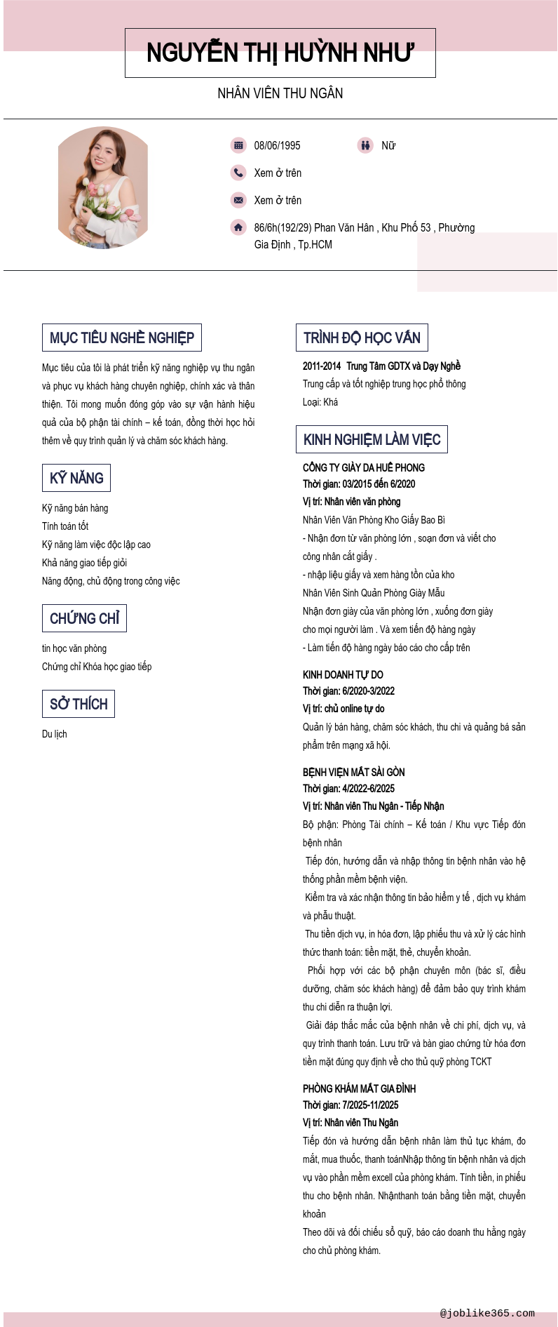 Xem hồ sơ ứng viên NGUYỄN THỊ HUỲNH NHƯ cần 2 điểm. Hồ sơ được cập nhật ngày: 13/11/2025